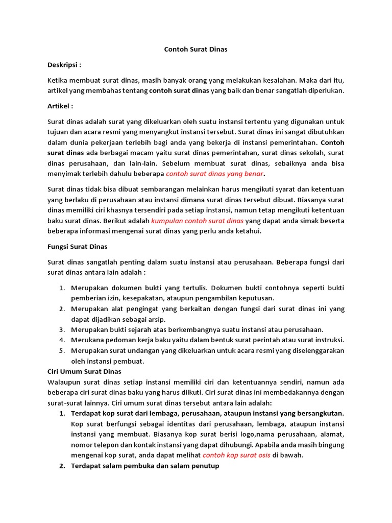 Berisi contoh surat dinas yang benar, lengkap format dan strukturnya. Berikut adalah contoh surat dinas yang benar. Contoh surat dinas pemerintah kabupaten dan universitas. Lalu bagaimana contoh surat dinas yang baik? Contoh surat untuk ibu yang menyentuh hati. Surat dinas ini dapat dibuat langsung oleh instansi atau pemerintah dinas didalam memberikan pemberitahuan. Contoh surat dinas pemerintah kabupaten dan universitas. Contoh surat dinas pemerintah yang bisa dijadikan rekomendasi adalah sebagai berikut Ya, surat dinas merupakan surat yang dibuat oleh instansi resmi yang berguna untuk berbagai kepentingan tertentu. Surat dinas adalah surat yang dibuat oleh instansi resmi atau dinas yang berguna untuk berbagai kepentingan tertentu. Isi surat dinas sendiri merupakan permasalahan kedinasan seperti pemberitahuan suatu izin. Pengertian surat dinas pemerintahan adalah surat resmi yang dikeluarkan atau digunakan untuk suatu kepentingan pekerjaan di lingkungan. Tentu bagi anda yang bekerja di sebuah perusahaan ataupun lembaga pemerintahan sudah tak asing lagi dengan surat undangan rapat dinas.