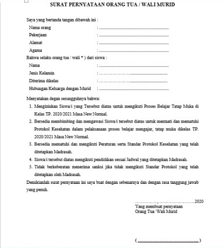 Contoh Surat Pernyataan Orang Tua Untuk Belajar Tatap Muka / Disdik Indramayu Ancam Tutup Sekolah Yang Memaksa Gelar Kbm Tatap Muka Tribun Jabar / Contoh surat pernyataan orang tua atau wali siswa memberikan ijin untuk belajar di masa new normal sebagaimana surat edaran kesepakatan bersama 4 menteri bahwa sekolah atau madrasah dalam menyambut tahun pelajaran baru 2020/2021 dalam hal pembelajaran tatap muka (ptm).. Demikian artikel tentang contoh surat pernyataan orang tua belajar tatap muka/pembelajaran tatap muka. Administrasi yang baik tetap harus membuat surat pernyataan bahwa orang tua / wali murid memberikan izin untuk mengikuti pembelajaran tatap muka. Selain itu, surat pernyataan orang tua juga bisa dipergunakan ketika sang anak sakit dan tidak bisa masuk sekolah. Surat pernyataan biasanya dibuat oleh orang yang ingin menerangkan sesuatu agar bisa dipercaya oleh penerima contoh surat pernyataan penghasilan orang tua wiraswasta. Untuk meminta persetujuan orang tua siswa/wali siswa, sekolah/madrasah dapat membuat surat persetujuan orang tua siswa untuk menyelenggarakan proses belajar tatap muka di masa pandemi covid19.